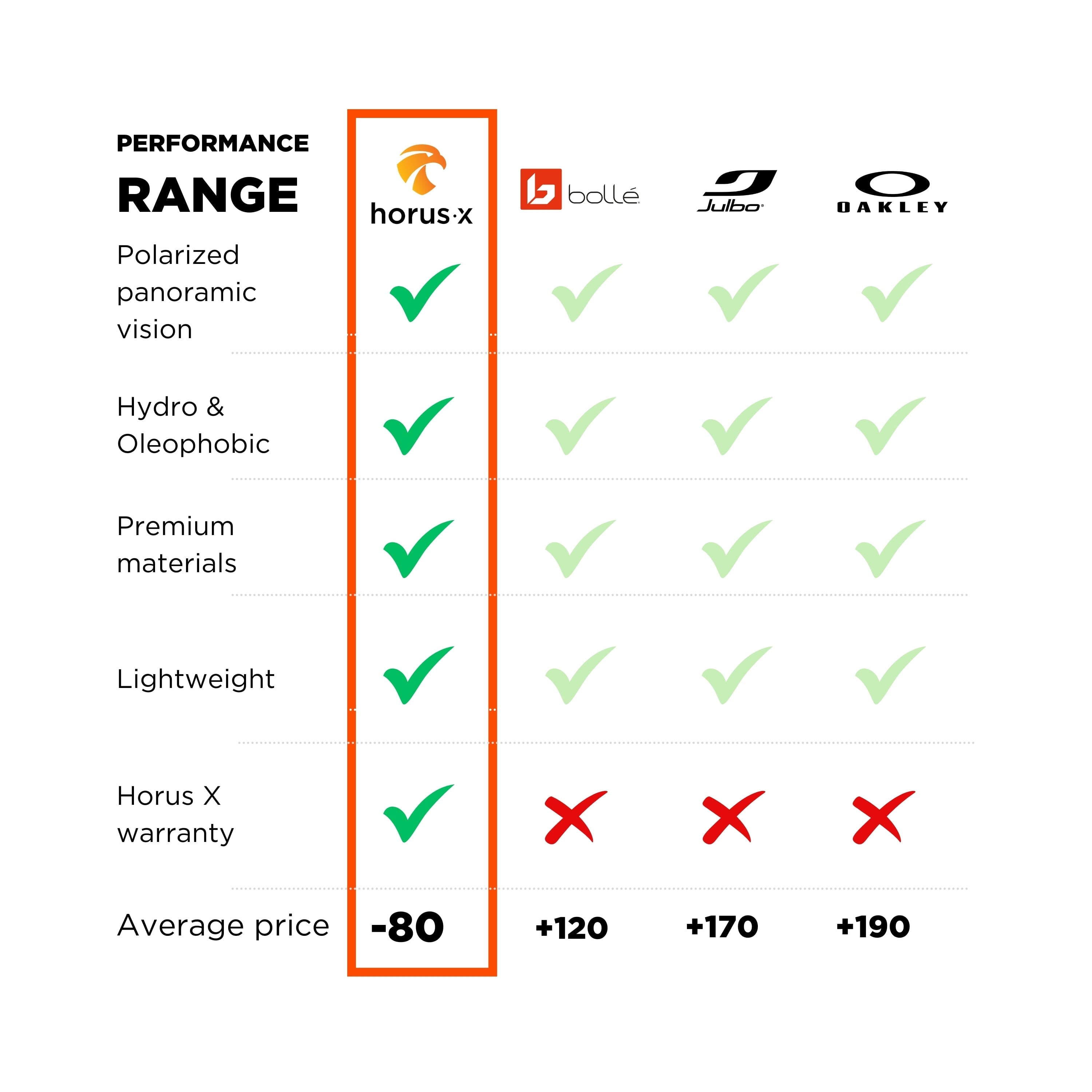 Le meilleur des technologies de haut niveau (course à pieds, cyclisme, trail, ski), amélioré par la technologie Horus X. Parfaites pour maximiser tes performances en extérieur, elles offrent une protection solaire optimale tout en assurant un confort et une clarté visuelle exceptionnelle grâce à leurs verres polarisés et leur traitement anti-buée, hydrophobe et oléophobe.