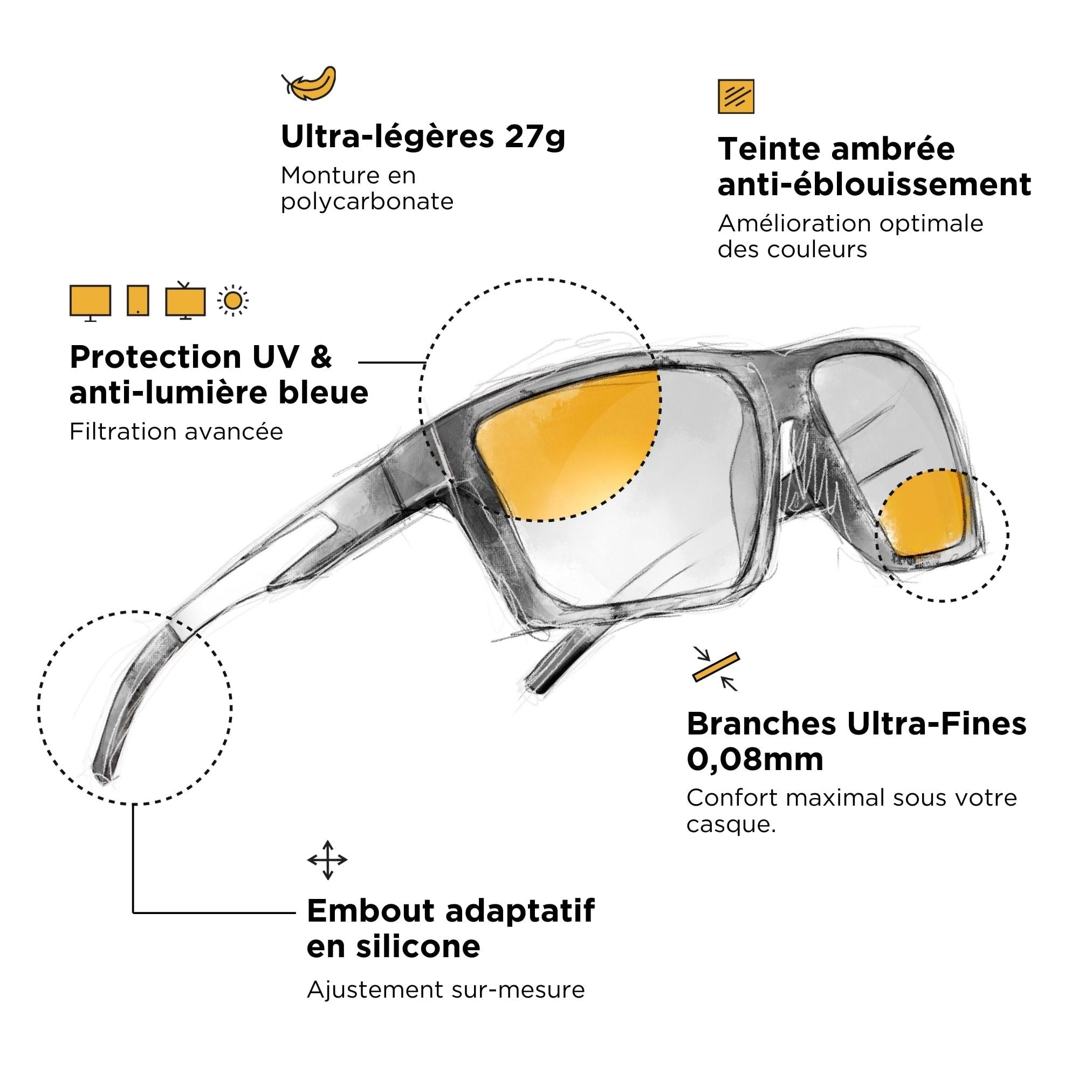 Un design racé et puissant pour des performances inégalées. Une finesse extraordinaire (0,8mm) en alliage métal signature Horus X®, avec embouts ajustables en silicone. Verres en polycarbonate japonais, matériaux ultras légers et durable.