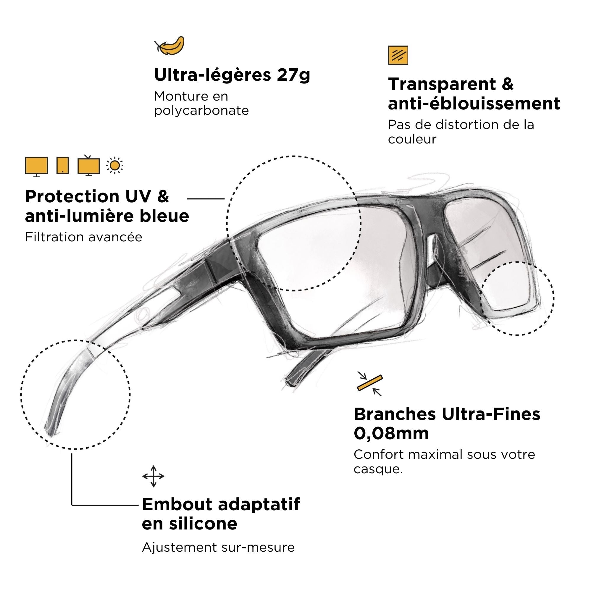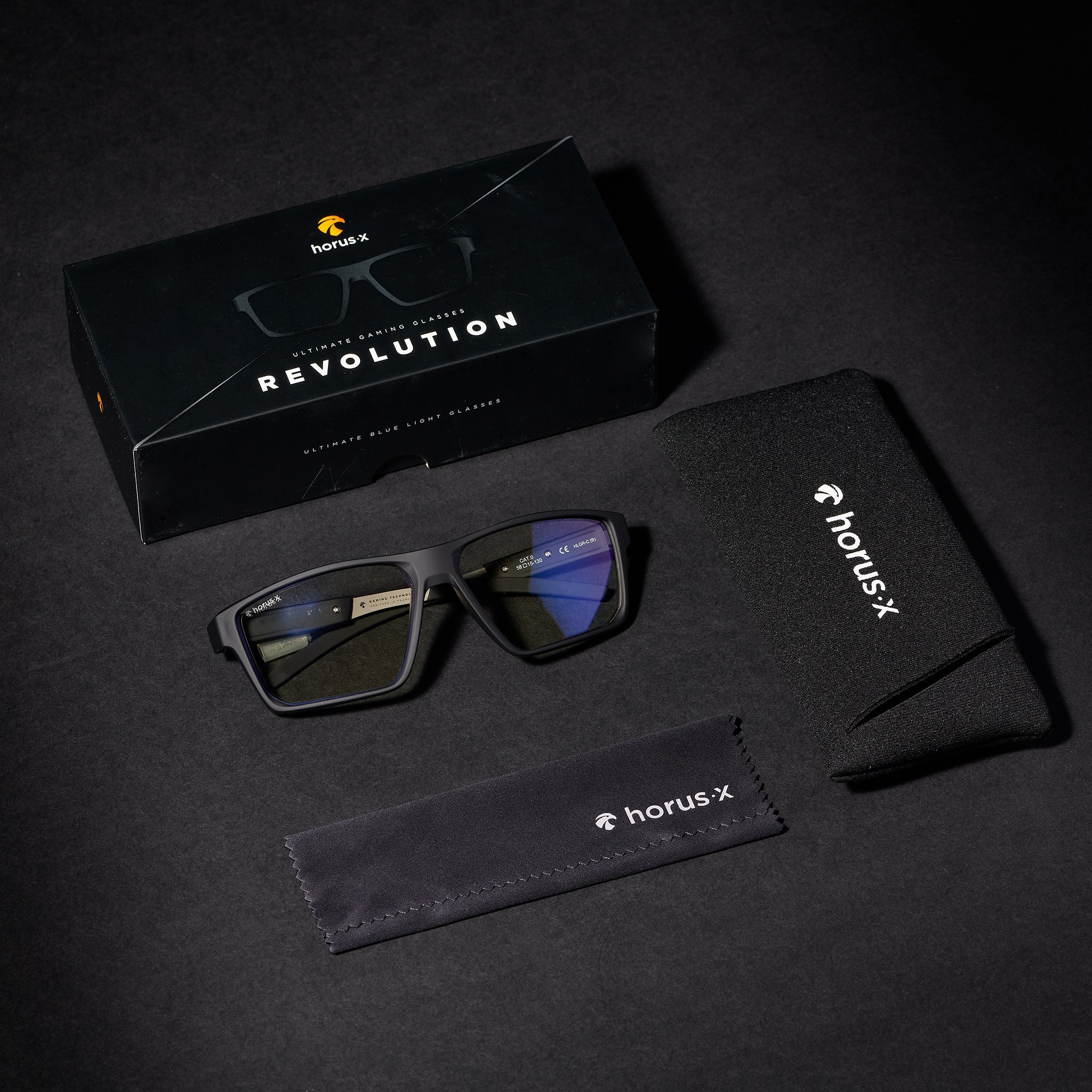 Lunettes pour gamer équipées des branches ajustables en alliage signature Horus X, l'évolution de notre lunette Gaming One offre un confort supérieur optimisé pour le port du casque.