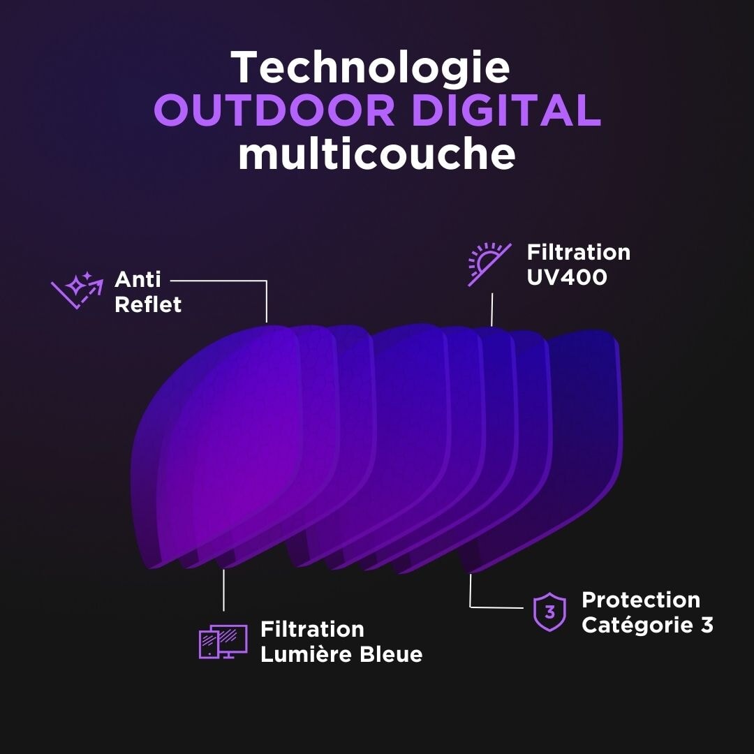 Les verres Darkmatter® ont été conçus pour te protéger efficacement du soleil (cat.3) mais un traitement particulier leur permet également de limiter l'éblouissement. Comme si ça ne suffisait pas ils sont aussi optimisés pour lire les écrans en extérieur et filtrent 96% de la lumière bleue. Le choix idéal pour travailler en terrasse l'été !