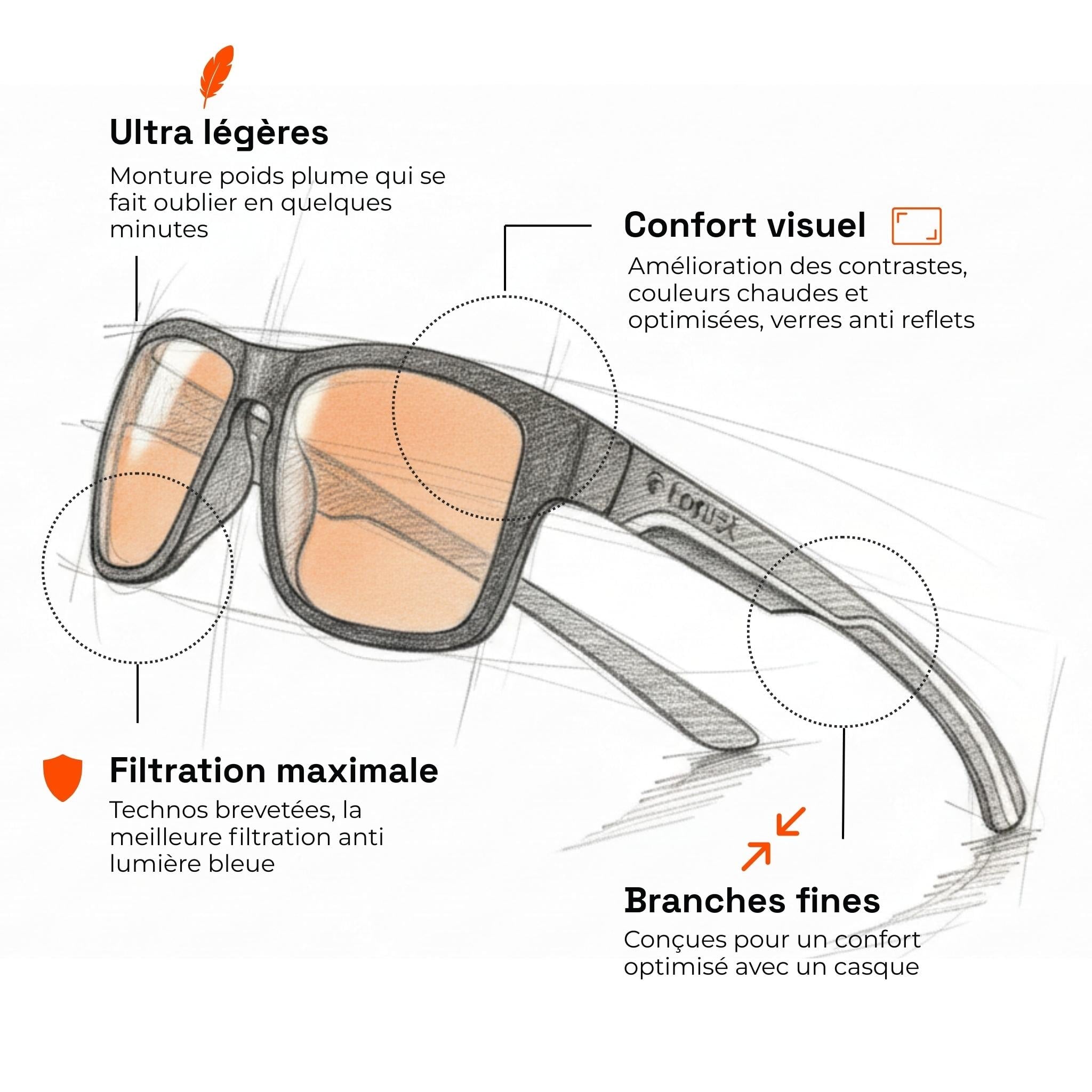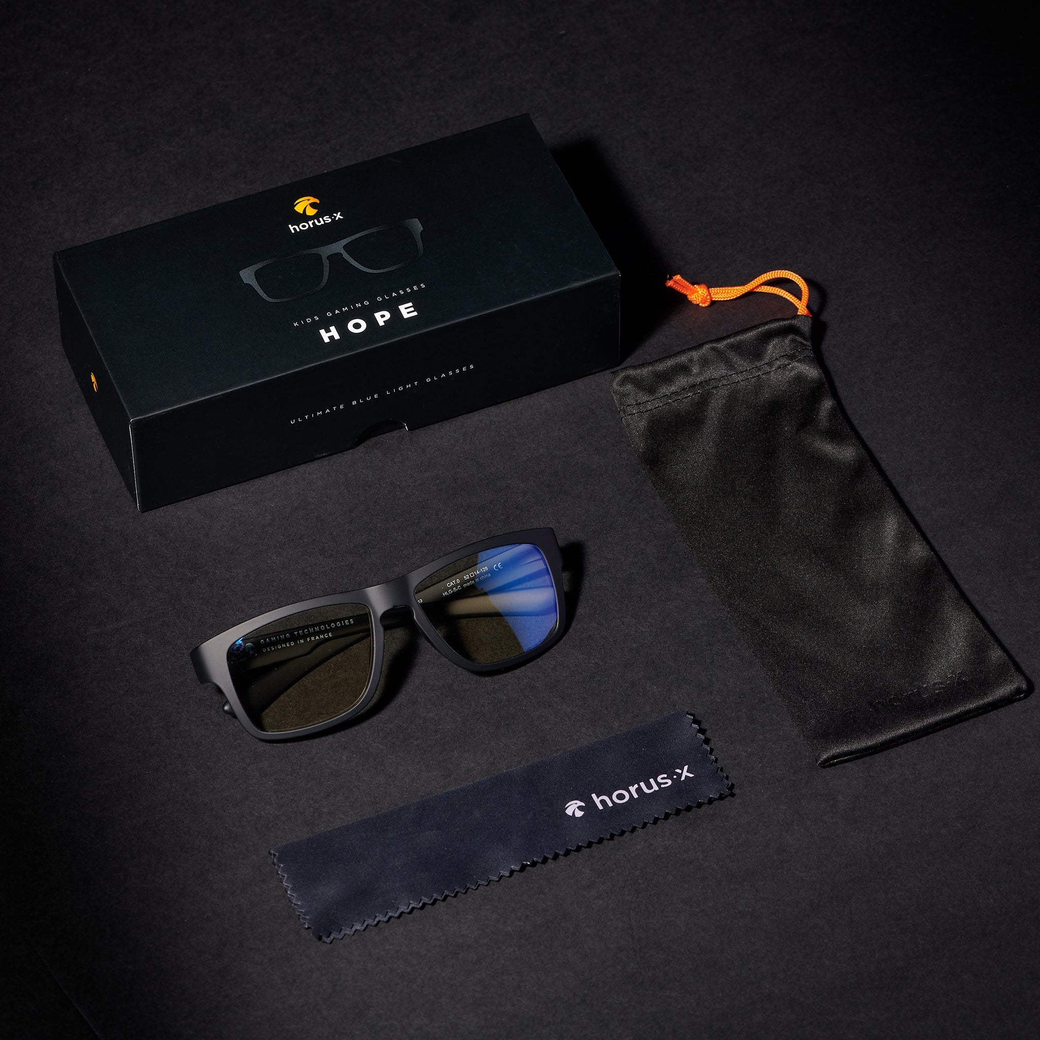 Nous avons travaillé très dur pour équiper nos lunettes gaming Horus X Hope des meilleurs matériaux. Branches et verres en polycarbonate Japonais, matériau ultra léger (20g!), doux & hypoallergénique. Un confort inégalé pour des heures de jeux, optimisé pour le port du casque.