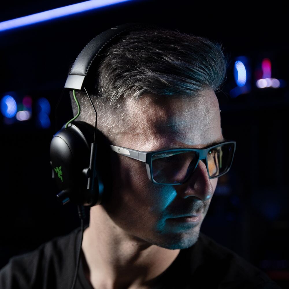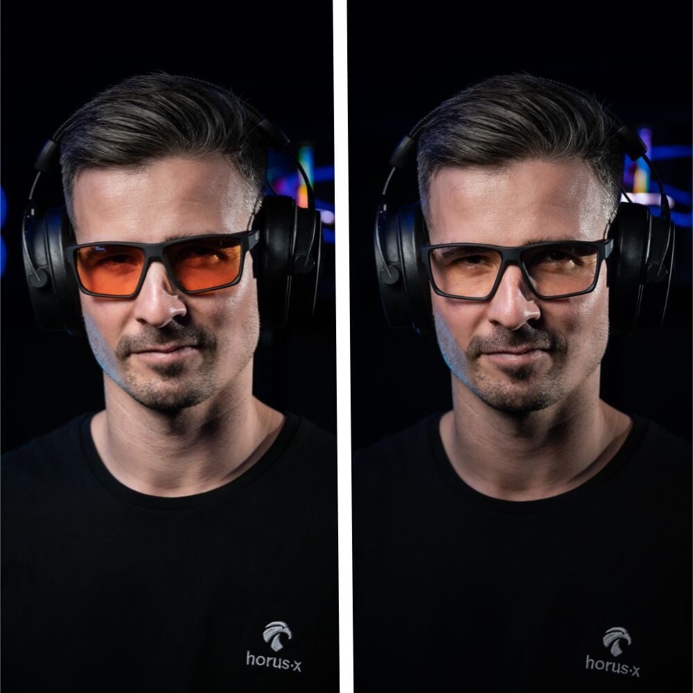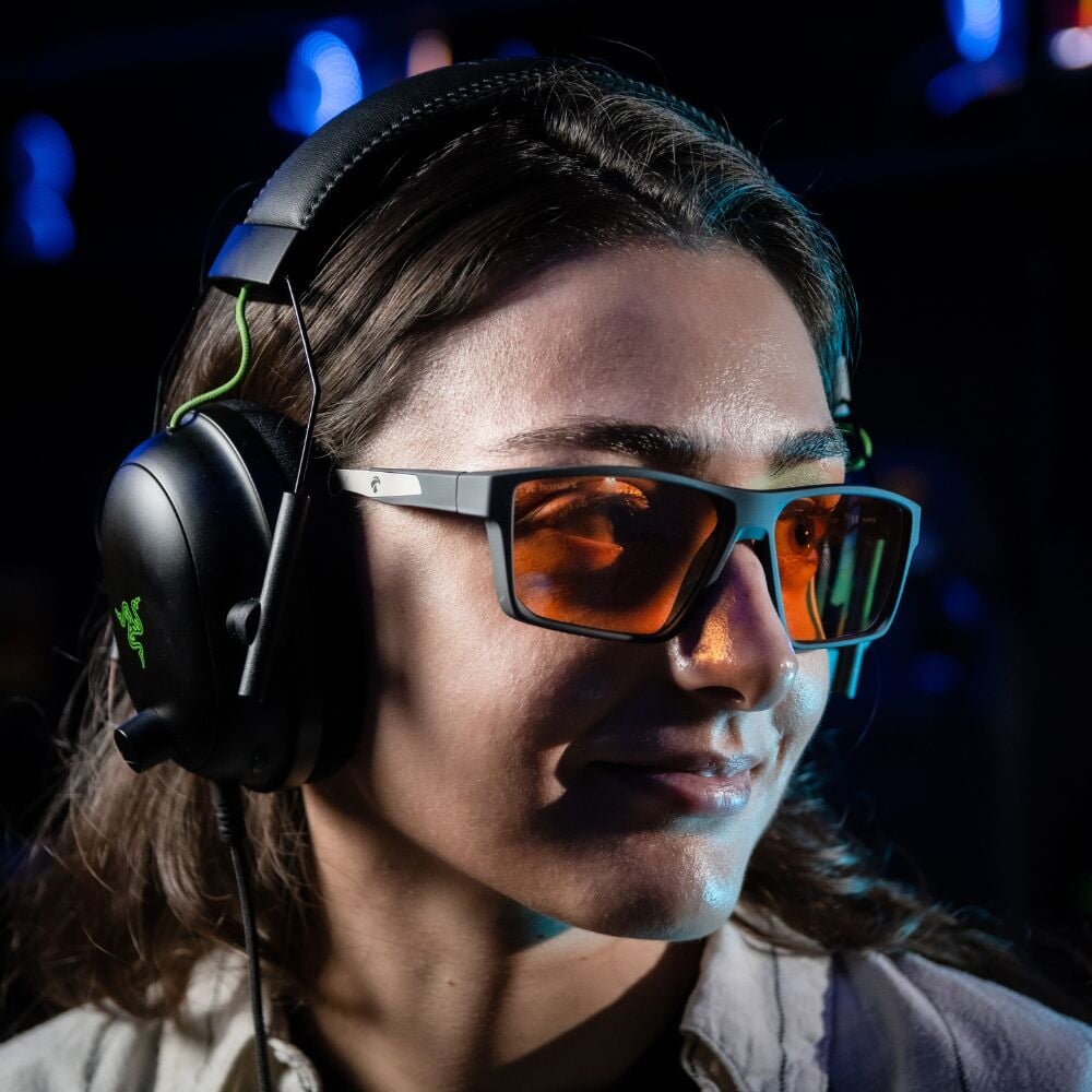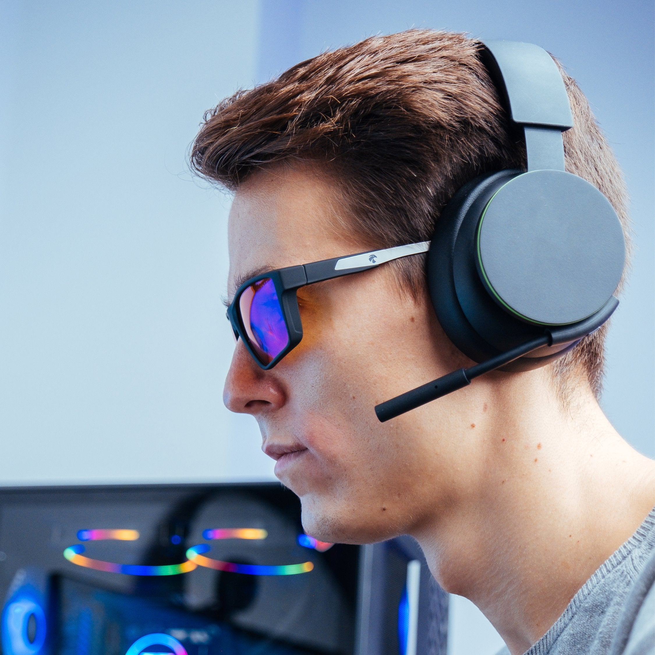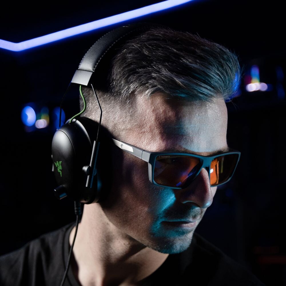 Lunettes pour gamer équipées des branches ajustables en alliage signature Horus X, l'évolution de notre lunette Gaming One offre un confort supérieur optimisé pour le port du casque.